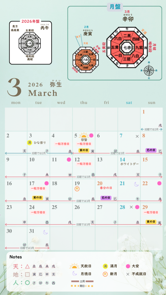 2026年3月の開運カレンダー 2026 3/26 よくある質問 2026年3月26日 よくある質問 よかったらシェアしてね! URLをコピーしました! URLをコピーしました! 【保存版】新月から始まる新しい自分✨朔日(ついたち)参りと開運の知恵 関連記事 【保存版】新月から始まる新しい自分✨朔日(ついたち)参りと開運の知恵 2026年3月18日 【保存版】六曜(ろくよう)の意味とは?時間帯ごとの吉凶や行事別の選び方を徹底解説! 2026年3月11日 手相|金星帯(きんせいたい) 2025年2月18日 気になる手相の基本 2024年1月21日 コメント コメントする コメントをキャンセルコメントを投稿するにはログインしてください。